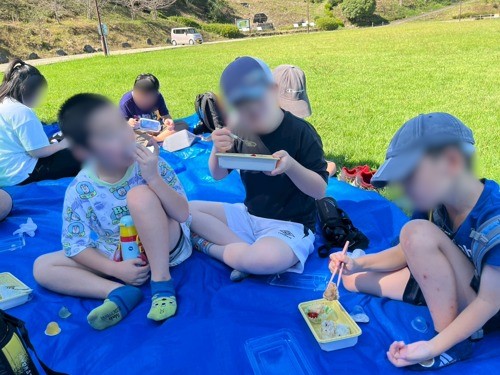 到着してからは、お弁当をみんなで食べ、原っぱで野球、フリスビー、竹馬などをして楽しみました。