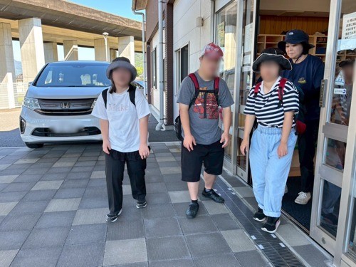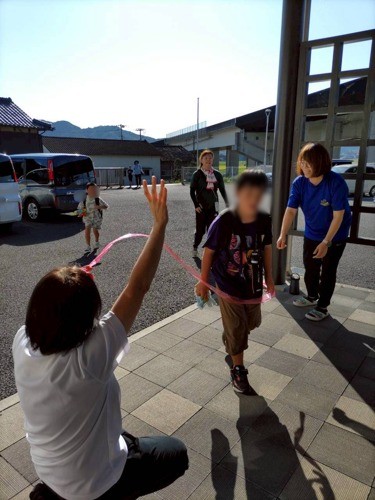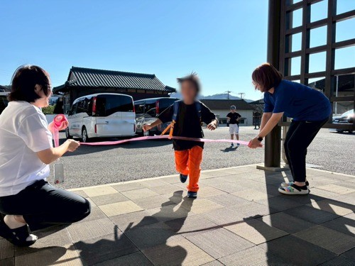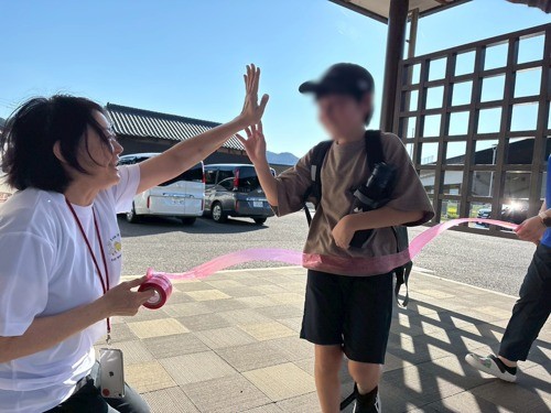 帰りも同じ道のりを歩いて帰りました。疲労感から歩調はゆっくりになりましたが、音楽をかけながら、みんなで協力して最後まで歩き切ることが出来ました。センターに着くと、職員がゴールテープと音楽で温かく迎え入れました。子どもたちは笑顔でテープを切り、職員とハイタッチをして、大きな達成感と成功体験を感じていました。