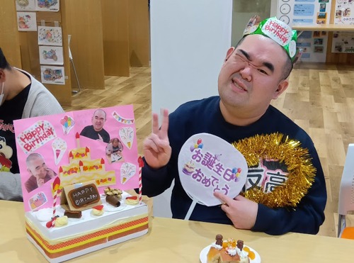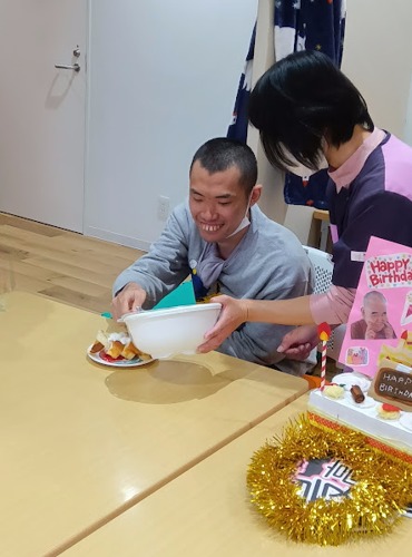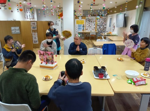 今月お誕生日を迎えられたご利用者様のために、誕生会を開催しました。皆で手作りのケーキを準備し、歌を歌ってお祝いしました。