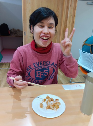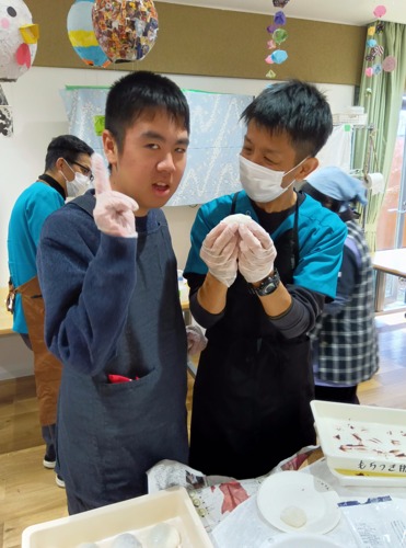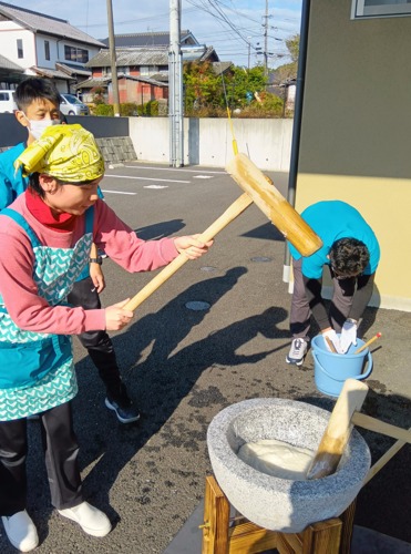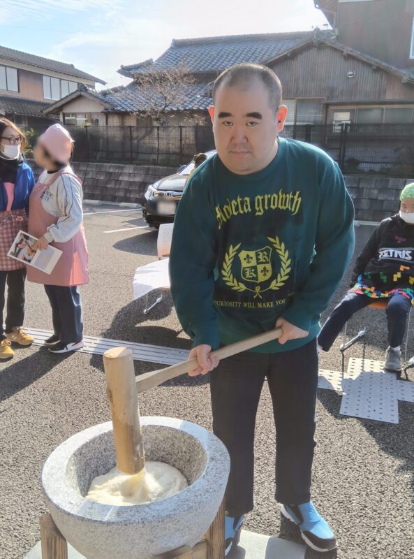 もちつき会を開催しました。 皆さんで息を合わせてぺったんぺったん(^_-)-☆ 自分でついたお餅は、あんこやきなこを添えて、お好みの味で美味しくいただきました♪