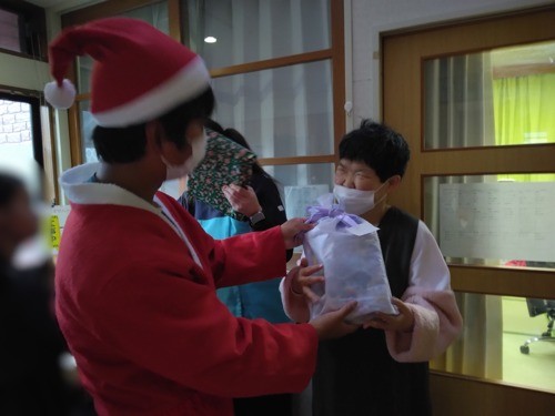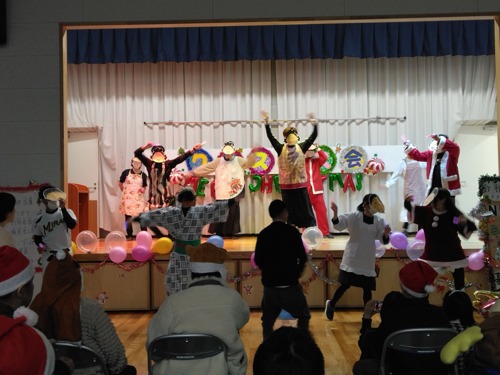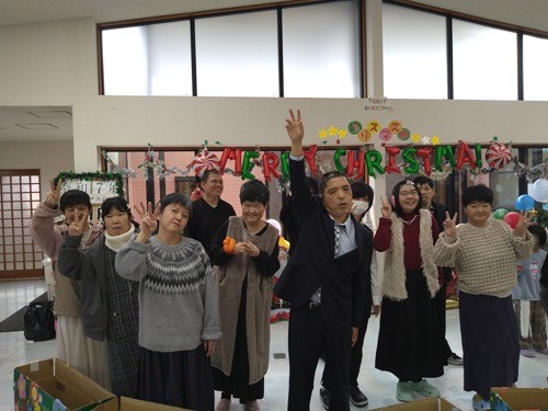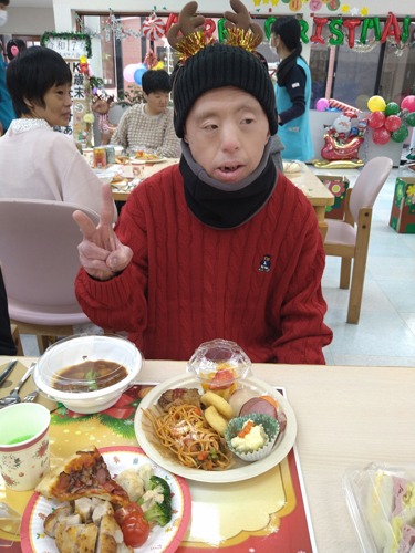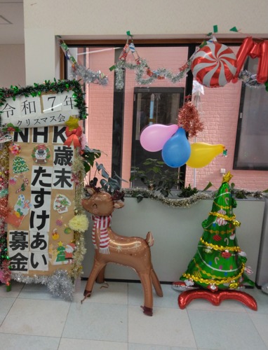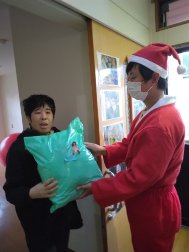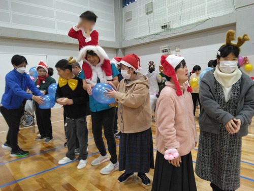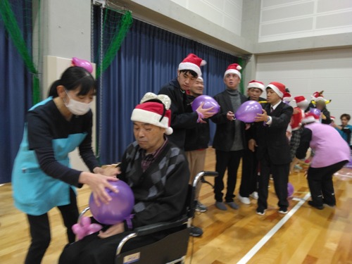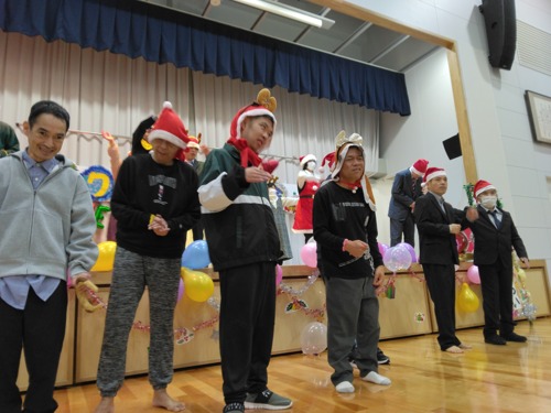 12月25日にクリスマス会が開催され、会場は終始あたたかな雰囲気に包まれていました。皆さんとても楽しまれ、利用者様や職員によるダンス披露もあり、大いに盛り上がりました。ミニゲーム(風船渡し)では、周囲と声を掛け合いながら和気あいあいと楽しまれていました。会食では、料理やケーキをゆっくり味わいながら、自然と会話も弾み、和やかな時間を過ごされていました。締めくくりのカラオケも、皆さんで楽しまれていました。その後、サンタさんからプレゼントを受け取り、皆さんの笑顔がこぼれていました。